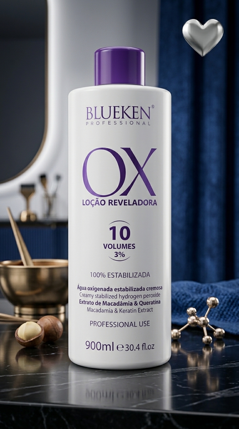 BLUEKEN > OX DE 10 VOLUMES - PREÇO UNITÁRIO > AÁgua Oxigenada 10 Volumes da Blueken é uma oxidante estabilizada, que possibilita cor duradoura e intensa, para trazer o máximo de desempenho, cobertura total dos fios e uma combinação ideal com o Pó Descolorante Blueken. Sua fórmula, com Queratina Hidrolisada e Óleo de Macadâmia, penetra nos poros capilares, mantendo a hidratação dos fios, promove diminuição do frizz, dá brilho e repara a